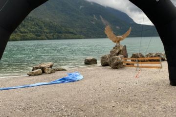 Quattro giorni di pioggia quasi continua avevano reso i tracciati di gara un pantano su cui facevi fatica a stare in piedi. Pensa a percorrerli in mtb a velocità folli in discesa con radici affioranti e quei sassi bianchi di dolomia che da bagnati sembra ci sia sopra il sapone. Senza contare che nuotare in questo lago da cartolina ma con l’acqua a 17º anche con la muta non è stata una passeggiata.