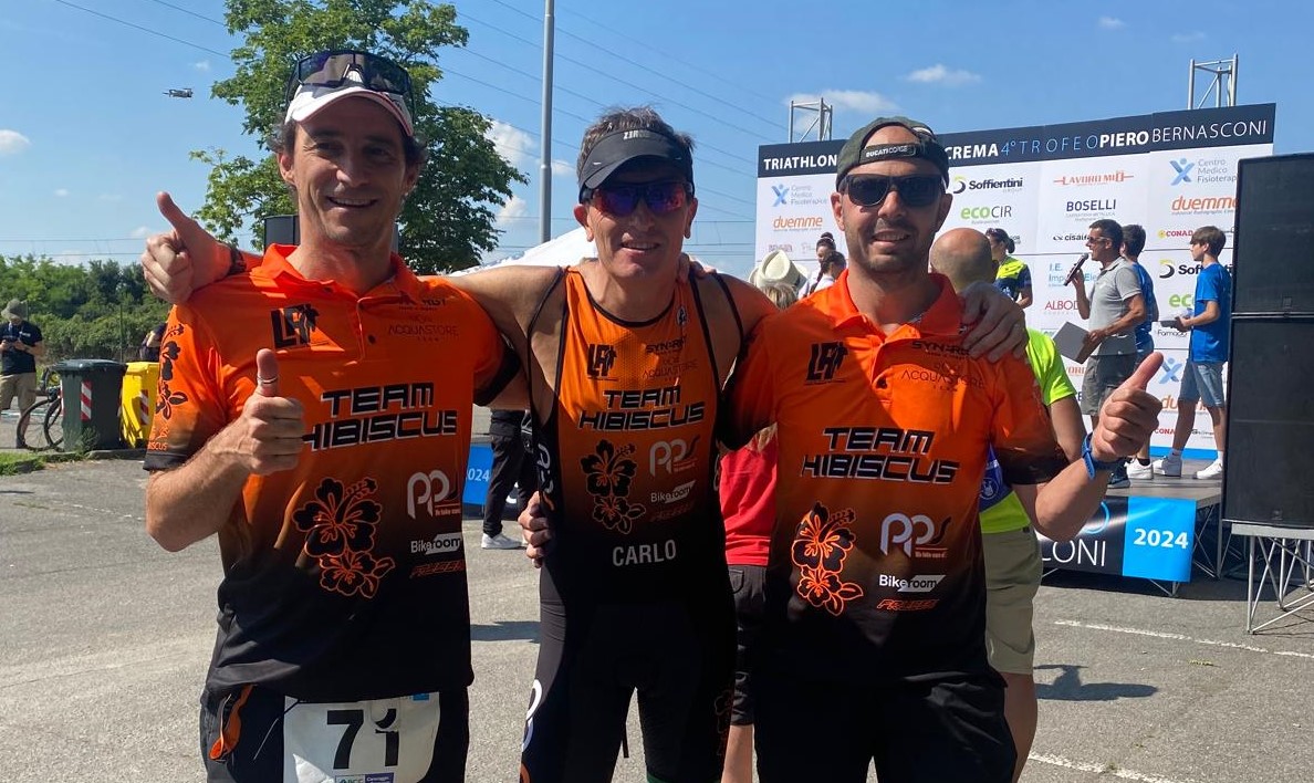 Alla gara troviamo presenti 4 Hibischi! Marco Fedele (1.17.56 - 17°M2) qui il suo debutto nella triplice 1 anno fa, il nostro coach Luca Alfonso (1.13.49 - 10°M3), Luca Cavenago (1.13.12 - 8°M3), specialista nei TRH in acque chiuse e Carlo Albini (1.06.44 - 2°M4) che centra anche quest'anno il podio con un 2° di categoria M4.