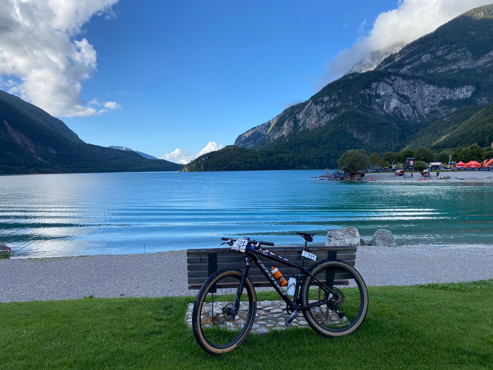 Quattro giorni di pioggia quasi continua avevano reso i tracciati di gara un pantano su cui facevi fatica a stare in piedi. Pensa a percorrerli in mtb a velocità folli in discesa con radici affioranti e quei sassi bianchi di dolomia che da bagnati sembra ci sia sopra il sapone. Senza contare che nuotare in questo lago da cartolina ma con l’acqua a 17º anche con la muta non è stata una passeggiata.